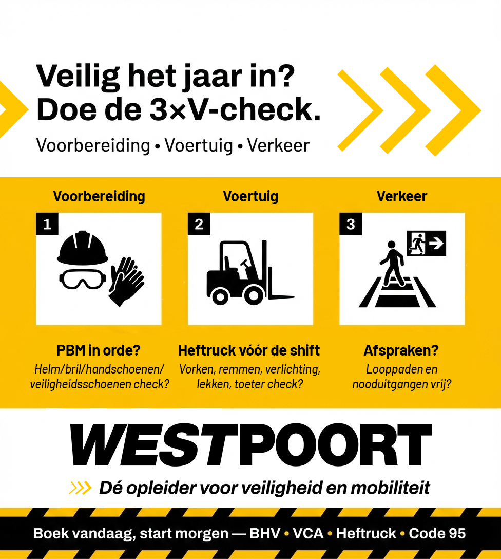 Amsterdam, 27 januari 2026 – Opleidingscentrum Westpoort introduceert de 3×V-check, een kort en krachtig start-van-de-dagritueel dat teams helpt om elke werkdag veiliger te beginnen. Met drie snelle controles, Voorbereiding, Voertuig, Verkeer, wordt veiligheid een gewoonte in plaats van een losse flodder.